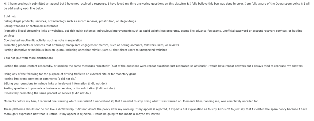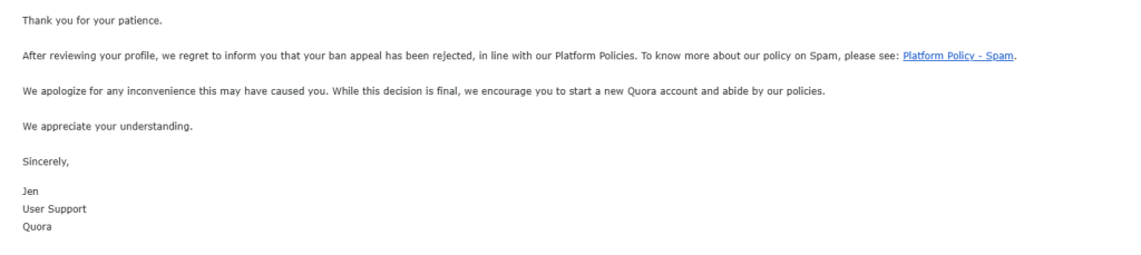 Getting banned from Quora is frustrating enough. Getting banned after you stop doing the very thing they warned you about, and then watching them deny your appeal without explanation, is a different level of infuriating.